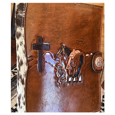 Hand sewn with concho snap closures. Available with your name carved on the cover.